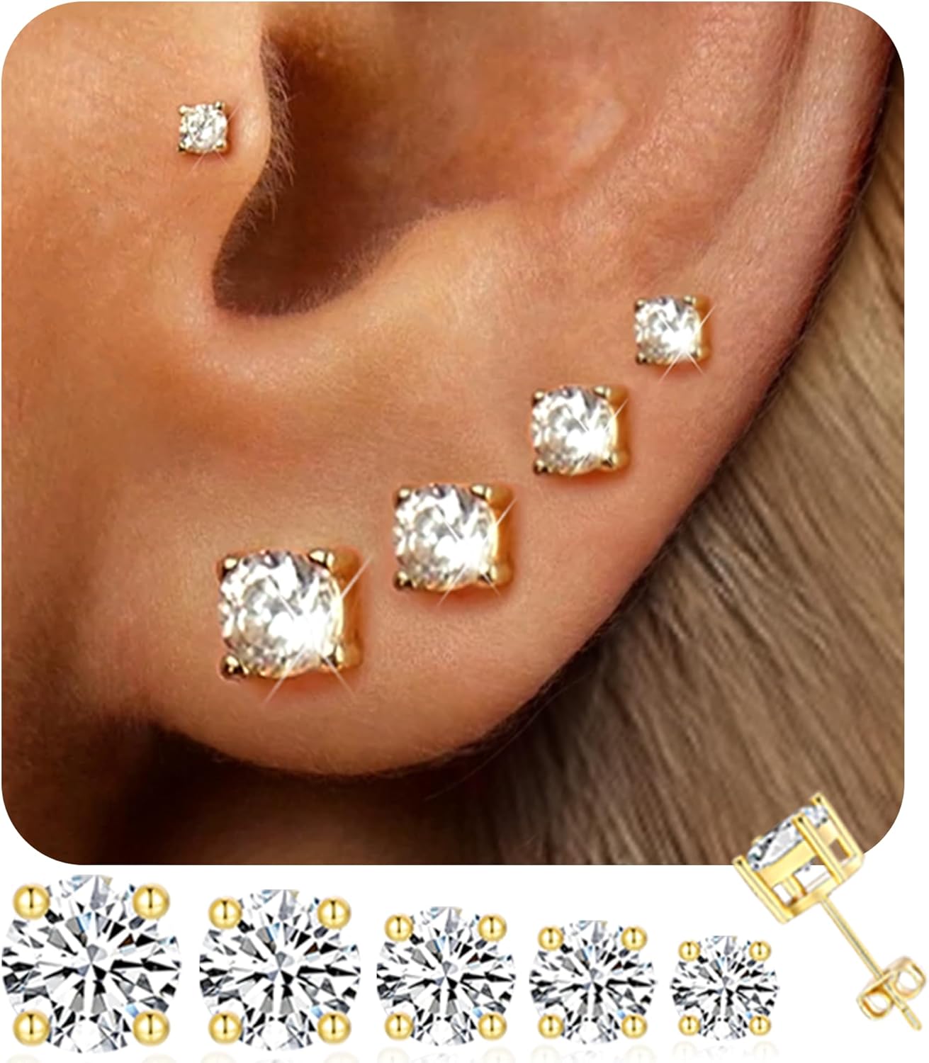 13 reviews for 5 Pairs 14K Gold Plated Stud Earrings for Women, Hypoallergenic Earring Sets for Multiple Piercing, Premium Cubic Zirconia Studs Earrings for Women