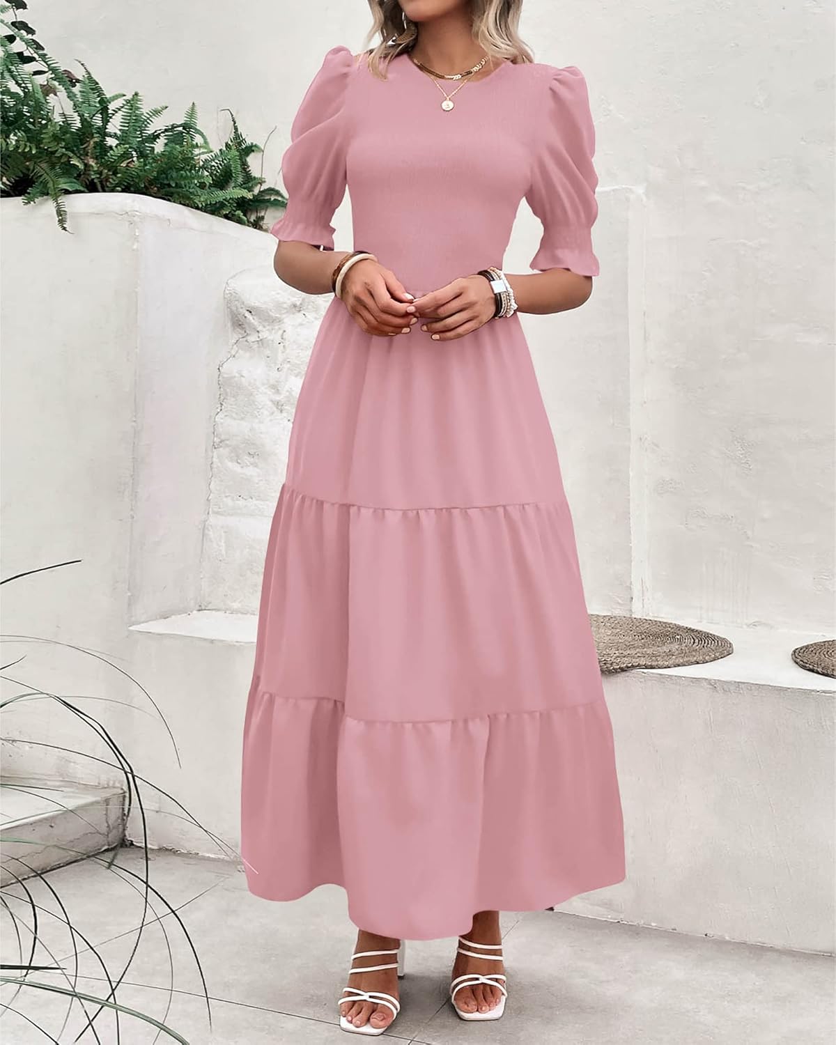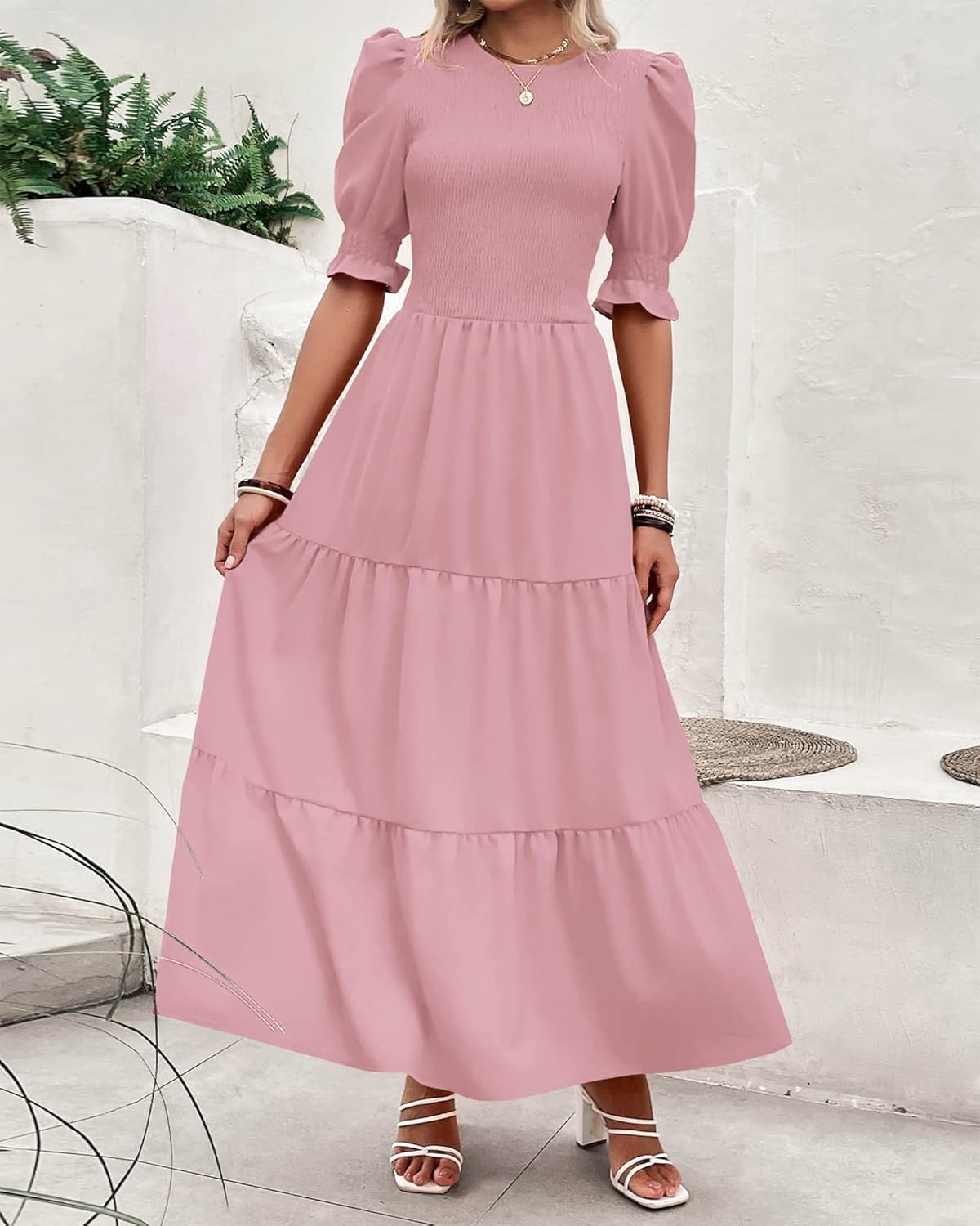 The Tiered Smocked Maxi Dress Is A Must-Have For Transitioning From Spring Into Fall. Cute Puff Short Sleeves, Crew Neck, Elastic High Waist And Tiered Ruffle Hem Complete This Ruffle tiered Dress.