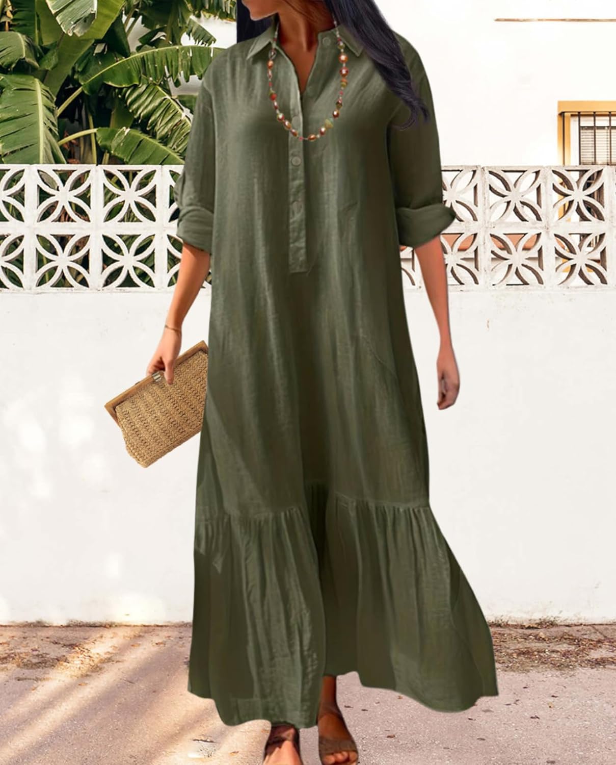 -Crafted from a natural cotton linen blend, this maxi dress offers exceptional breathability that keeps you comfortable in both spring breezes and summer heat. The fabric features a textured, lightweight weave that allows optimal air circulation while providing enough structure to maintain an elegant silhouette. -The dress combines the casual elegance of a shirt dress with the graceful length of a maxi, featuring a deep V-neckline that elongates the neckline and creates a sophisticated silhouette. The long sleeves can be worn down for coverage or casually rolled up for a more relaxed look. -Perfect for spring through summer transitions, this dress works beautifully for beach vacations, resort stays, garden parties, and casual city exploration. Its adaptable design makes it suitable for travel days, sightseeing, outdoor dining, and casual summer events. -The elegant maxi length provides beautiful drape and movement while offering practical sun protection and coverage. The relaxed fit allows for comfortable movement during various activities, while the quality construction ensures the dress maintains its shape throughout the day.