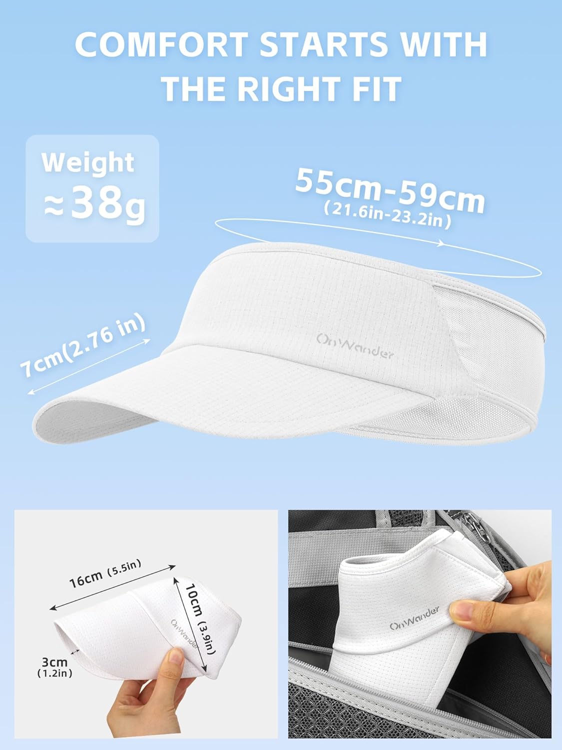 Super light weight.Incredibly comfortable.Quality. Fits well. Looks great.White visor easily spot cleans (got dirty in my suitcase)Will likely purchase in additional colors.